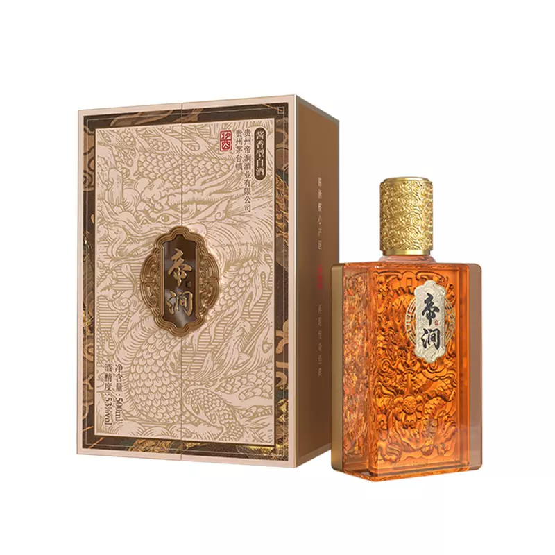 Exuding imperial grandeur with amber-hued liquor and dragon-adorned gift box. Ideal for state-level banquets and prestigious gifting, epitomizing oriental luxury.